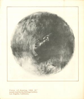 Like the accompanying catalogue itself, the card was illustrated with White's "Vision", oil drawing, 1968, 20" round. Lent by the Heritage Gallery, Los Angeles, California.