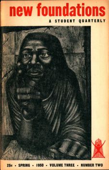 Charles White consistently lent his drawings to be used on the covers of progressive, left-leaning journals. Such journals included New Foundations, which described itself as "a publication devoted to the political. cultural and intellectual problems of American students. Its purpose is to stimulate clear thinking and progressive social action in all fields of study and activity and to express the needs, activities and aspirations of student America. NEW FOUNDATIONS actively combats reactionary and fascist ideologies in all their manifestations and presents a positive approach to the solution of the problem of American students - an approach infused with the creative spirit of socialism. The orientation of this magazine will be militantly progressive, with the aim of stimulating Marxist thought and practice." ['The Principles... inside cover of Volume 3 Number 2,Spring 1950]. This was truly a progressive publication, which carried the slogan "THE EARTH SHALL RISE ON NEW FOUNDATIONS".