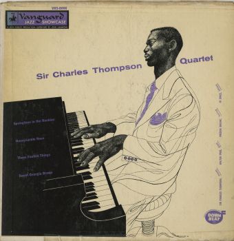 In 1954, Charles White provided an illustration for the cover of the eponymously titled Sir Charles Thompson Quartet. The record was released on the Vanguard label as part of its Vanguard Jazz Showcase – VRS-8006. Again, it was a 10" mono recording. Sir Charles Thompson (1918 – 2016) was an American swing and bebop pianist, organist, composer, and arranger. The cover of Sir Charles Thompson Quartet was very similar to the cover of Sir Charles Thompson Trio, featuring a drawing of a pianist. While the Trio sleeve had sparingly used yellow, on the pianist's tie, jacket pocket handkerchief, jacket sleeve buttons, typography, and so on, the Quartet sleeve had opted instead for a light purple colour. Unlike Trio, which appeared to have cropped from its cover drawing the signature of Charles White, and did not carry in its sleeve notes any references to him, the reproduction on the cover of Quartet carried White's signature and the date of '54.